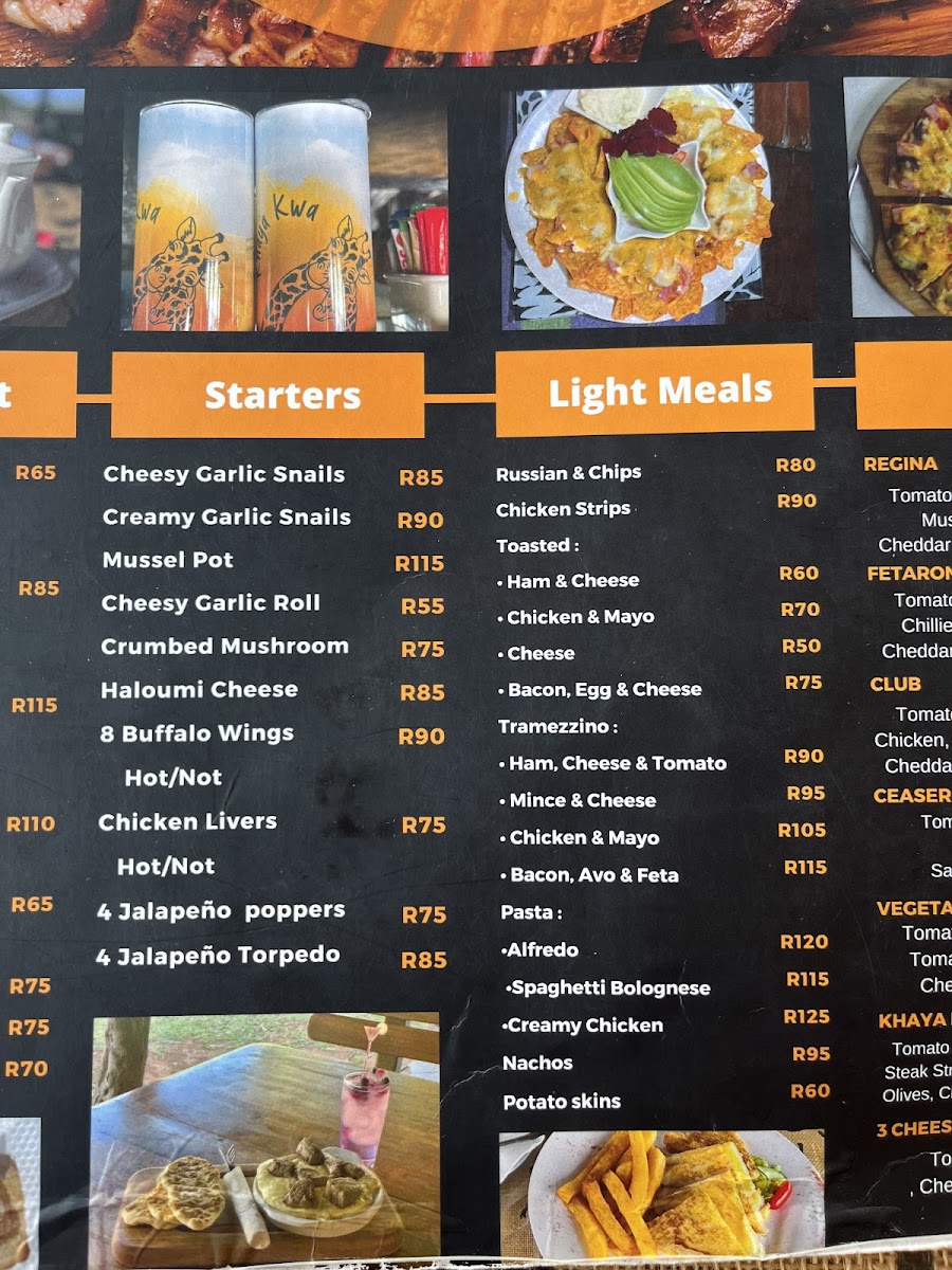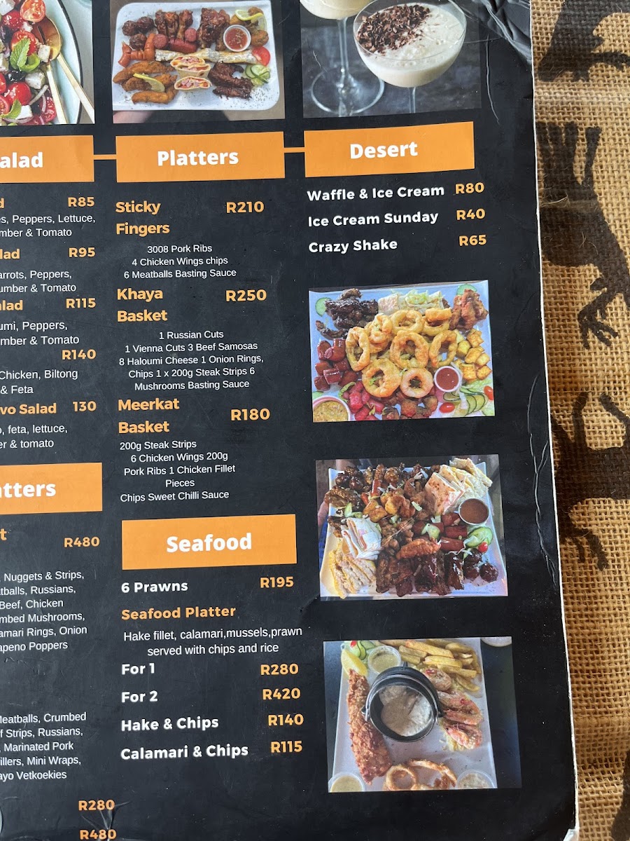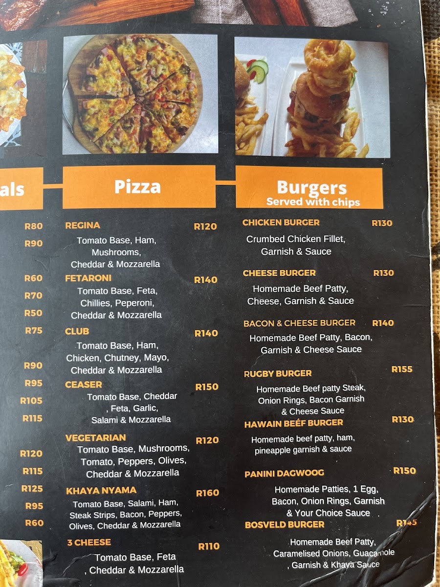 Khaya Kwa Restaurant & Bar offers a delightful and varied menu that caters to a wide range of tastes and preferences, making it a popular choice for locals and tourists alike in Thabazimbi. One of the standout items is the Seafood Platter, a perfect choice for seafood lovers, packed with a generous selection of fresh, oceanic delights. For those in the mood for a tasty appetizer, the Buffalo Wings provide a flavorful kick with their spicy glaze. For a sweet treat, Crazy Milkshakes offer a fun and indulgent option, making them a great choice for dessert or a mid-meal refreshment.