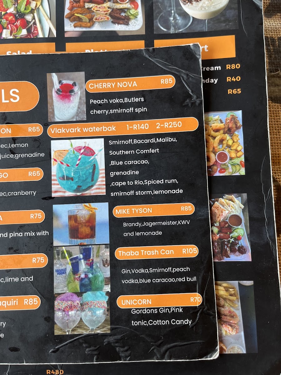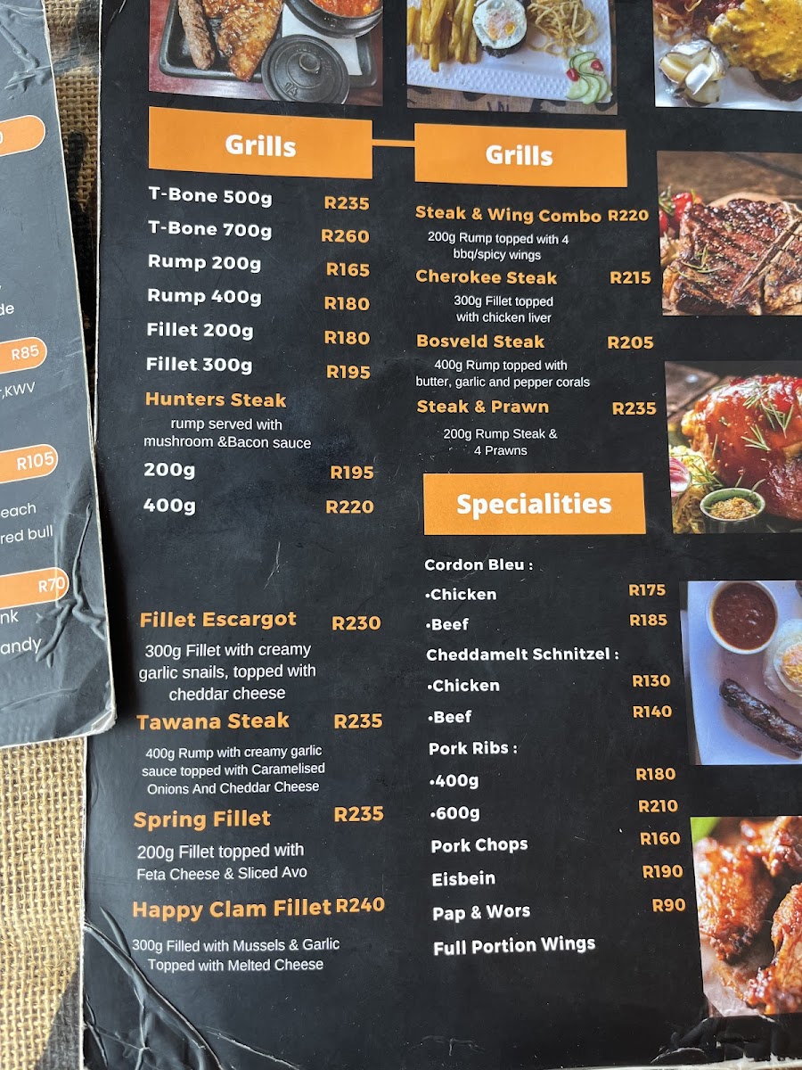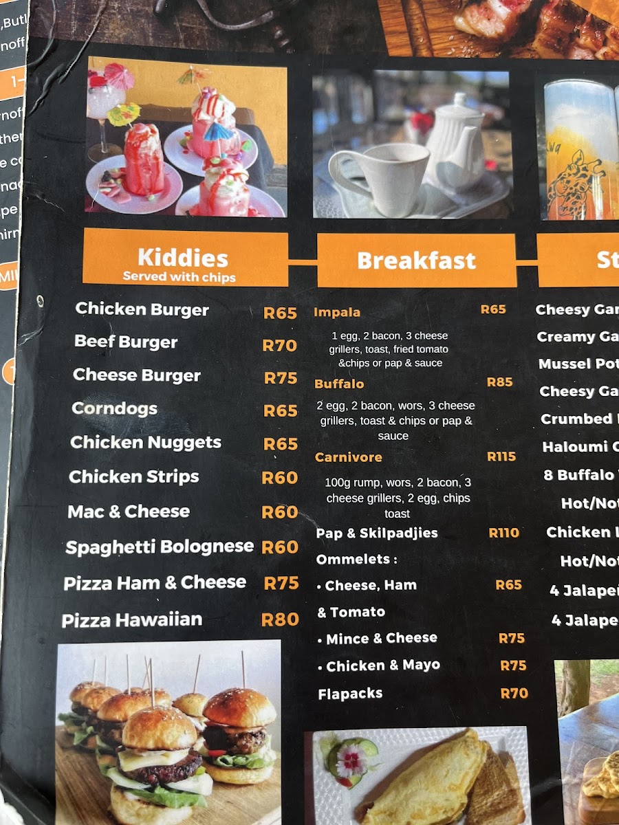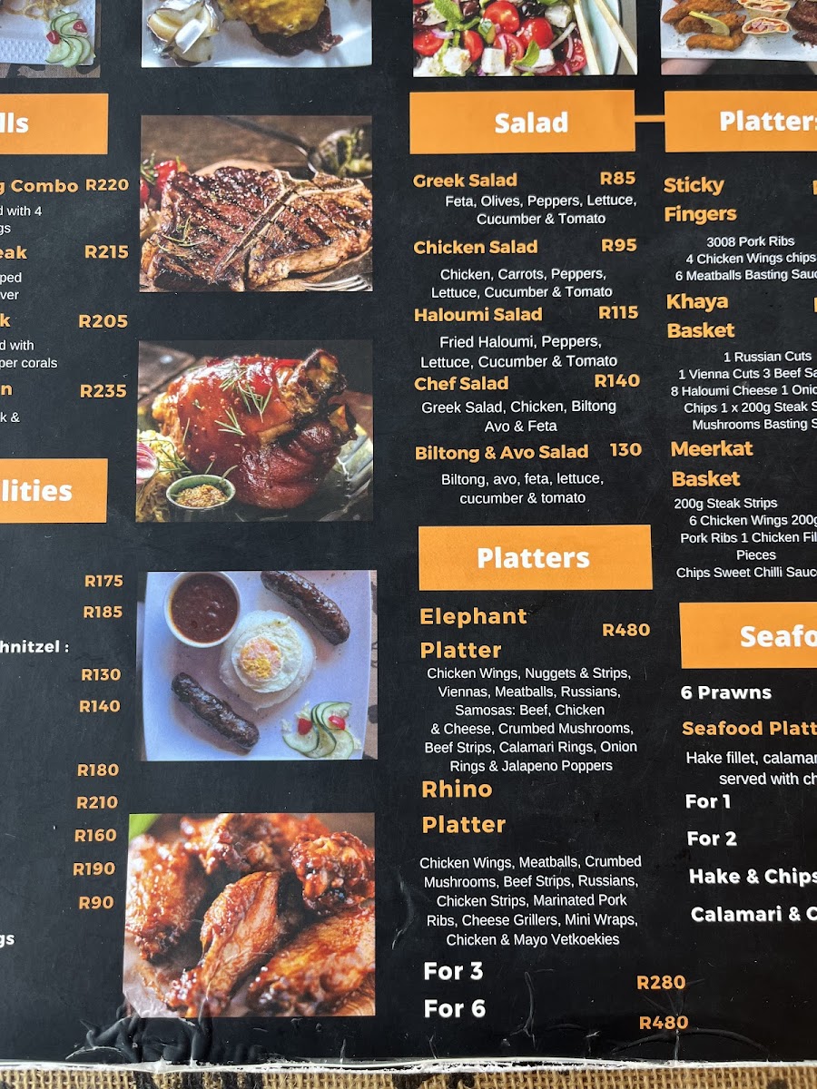 Khaya Kwa Restaurant & Bar offers a delightful and varied menu that caters to a wide range of tastes and preferences, making it a popular choice for locals and tourists alike in Thabazimbi. One of the standout items is the Seafood Platter, a perfect choice for seafood lovers, packed with a generous selection of fresh, oceanic delights. For those in the mood for a tasty appetizer, the Buffalo Wings provide a flavorful kick with their spicy glaze. For a sweet treat, Crazy Milkshakes offer a fun and indulgent option, making them a great choice for dessert or a mid-meal refreshment.